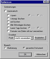 Zum Optimieren von Code haben Sie mehrere Möglichkeiten. Die Option 'Automatisch' ist ideal, um mit MS Word 2000 generierte HTML Seiten zu verkleinern. Sie können aber auch benutzerdefinierte Veränderungen vornehmen wie das Löschen von leeren Tags, von speziellen Formatierungen usw.